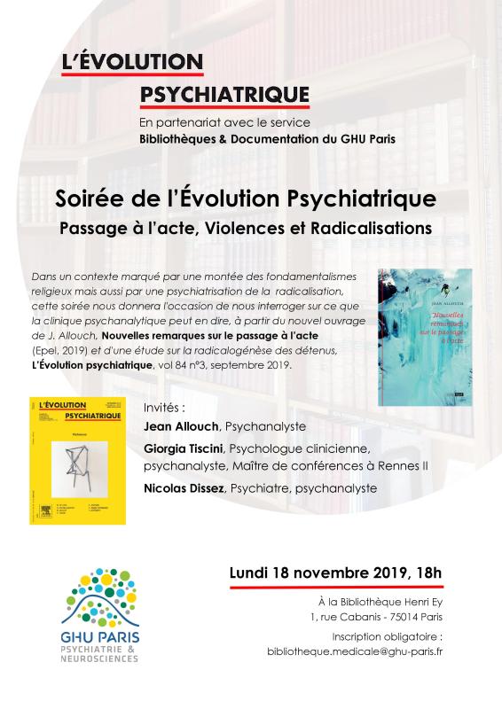 Dans un contexte marqué par une montée des fondamentalismes religieux mais aussi par une psychiatrisation de la radicalisation, cette soirée nous donne l’occasion de nous interroger sur ce que la clinique psychanalytique peut en dire, à partir du nouvel ouvrage de J. Allouch, Nouvelles remarques sur le passage à l’acte (Epel 2019) et d’une étude de la radicalogénèse des détenus, par G. Tiscini et T. Lamote (Evolution psychiatrique, vol. 84, n°3, 2019).