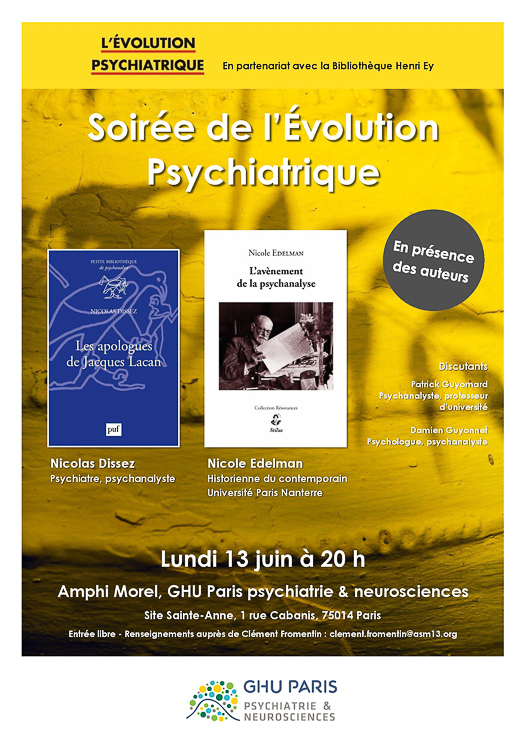 Le Lundi 13 juin à 20h : Amphithéâtre Morel. GHU site Sainte-Anne. 1 rue Cabanis.