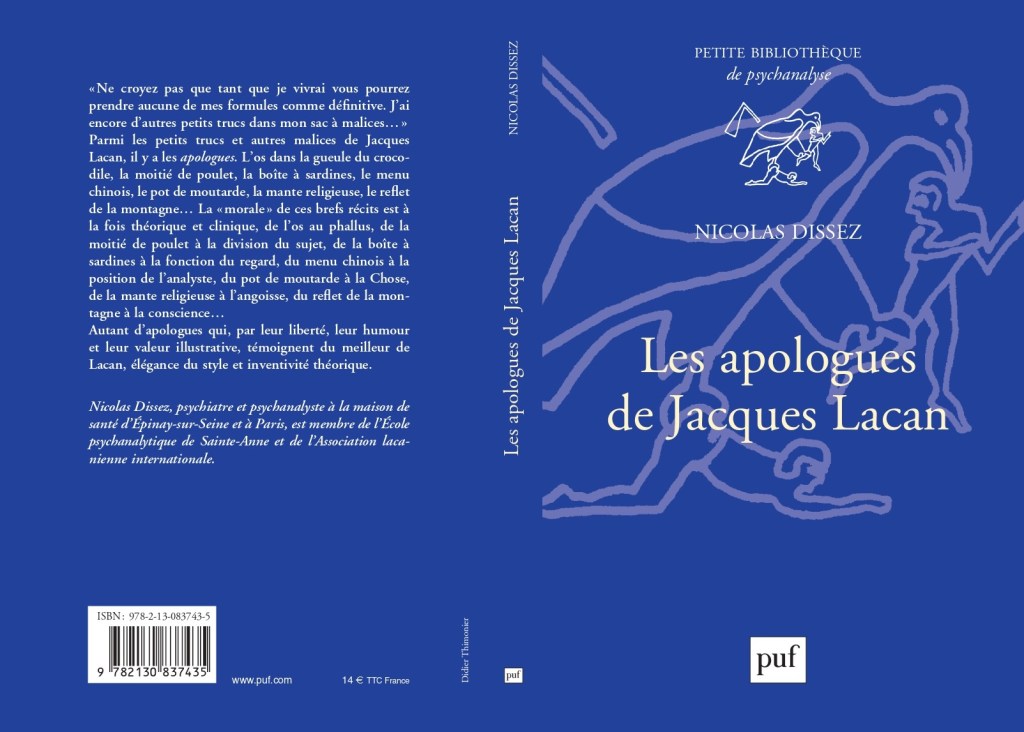 Premier ouvrage du Dr Nicolas Dissez, psychiatre, psychanalyste à l’Association lacanienne internationale (ALI), Les Apologues de Jacques Lacan, au PUF, 2022.