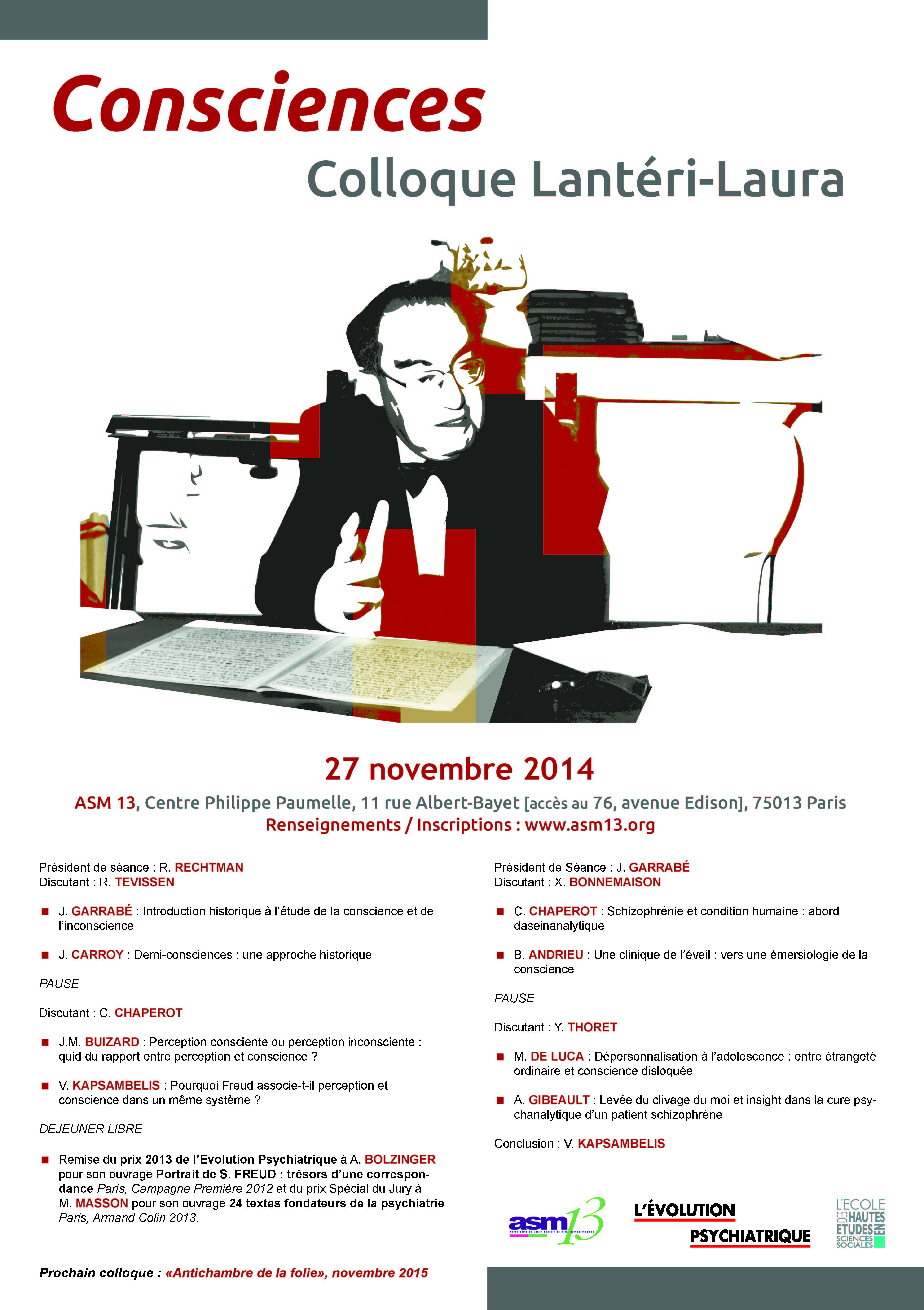 Le premier « colloque Lanteri-Laura » a eu lieu à l’Association de Santé Mentale du XIIIearrondissement, le 27 novembre 2014. Cet événement avait été coorganisé avec la Société de l’Évolution Psychiatrique et l’École des Hautes Études en Sciences Sociales, le thème de cette année était « Consciences ».