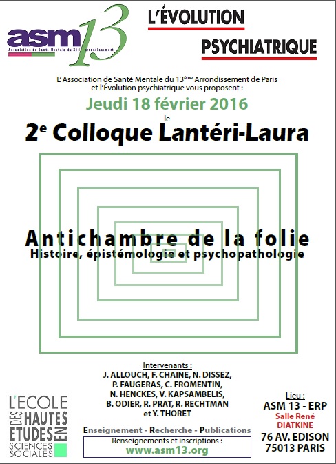 Le thème du second colloque Lantéri-Laura, consacré à la question de l’Antichambre de la folie, se veut fidèle à l’ambition épistémologique et psychopathologique du Pr. Lantéri-Laura. Cette journée est une invitation à l’étude des formes limites de la folie, celles qui existent à la frontière des catégories instituées des sciences du psychisme, telles que celles du deuil, de la passion amoureuse, ou des modalités d’entrées dans la maladie mentale. Il s’agit de sonder ce lieu charnière où les choses se dessinent et peuvent, ou non, basculer.