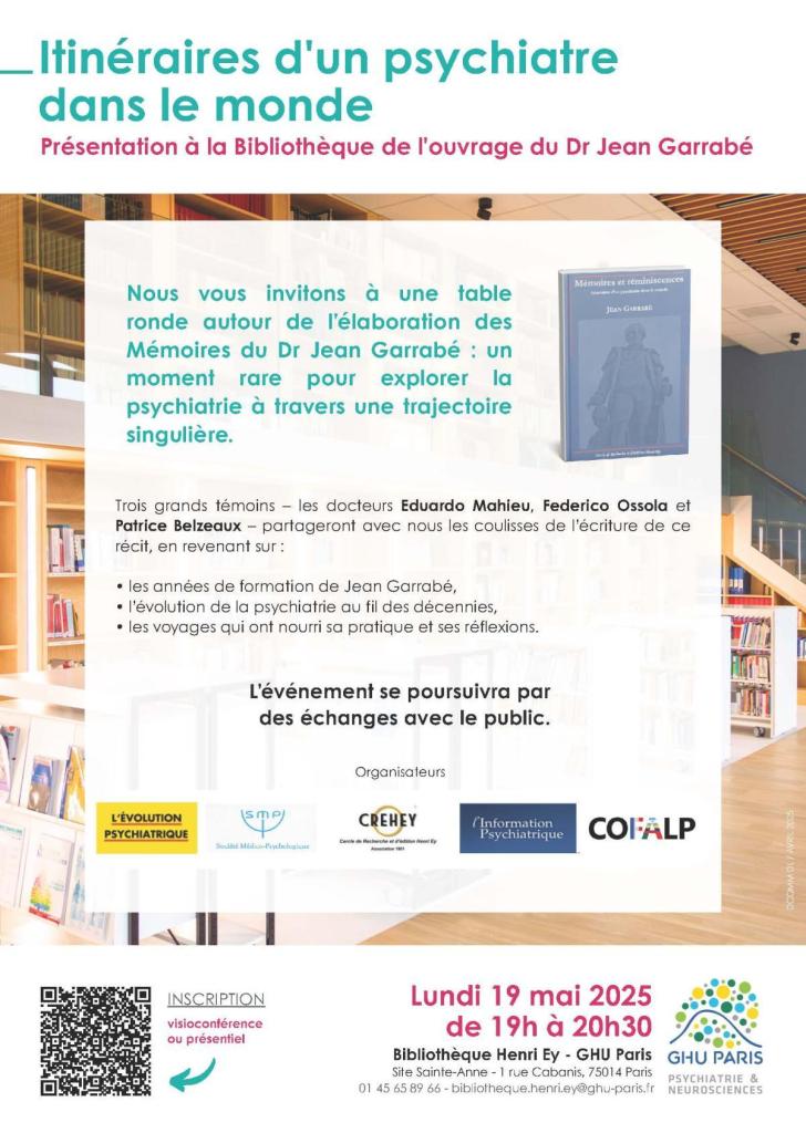 Lundi 19 mai à 20h30 – Présentation des Mémoires et réminiscences de Jean Garrabé à la Bibliothèque Henri Ey de Sainte-Anne De gauche à droite : Clément Fromentin, Patrice Belzeaux, Eduardo Mahieu et Federico Ossola. Vous devriez également aimer Savoirs psychiatriques et organisations institutionnelles : quels rapports ? par Stéphane Zygart. 10 décembre 2022 Conférence de F. Leguil : Le débat Henri Ey – Jacques Lacan : Etiologie organique ou causalité psychique 8 février 2022 Volume 84, Issue 3: Violences 28 septembre 2019